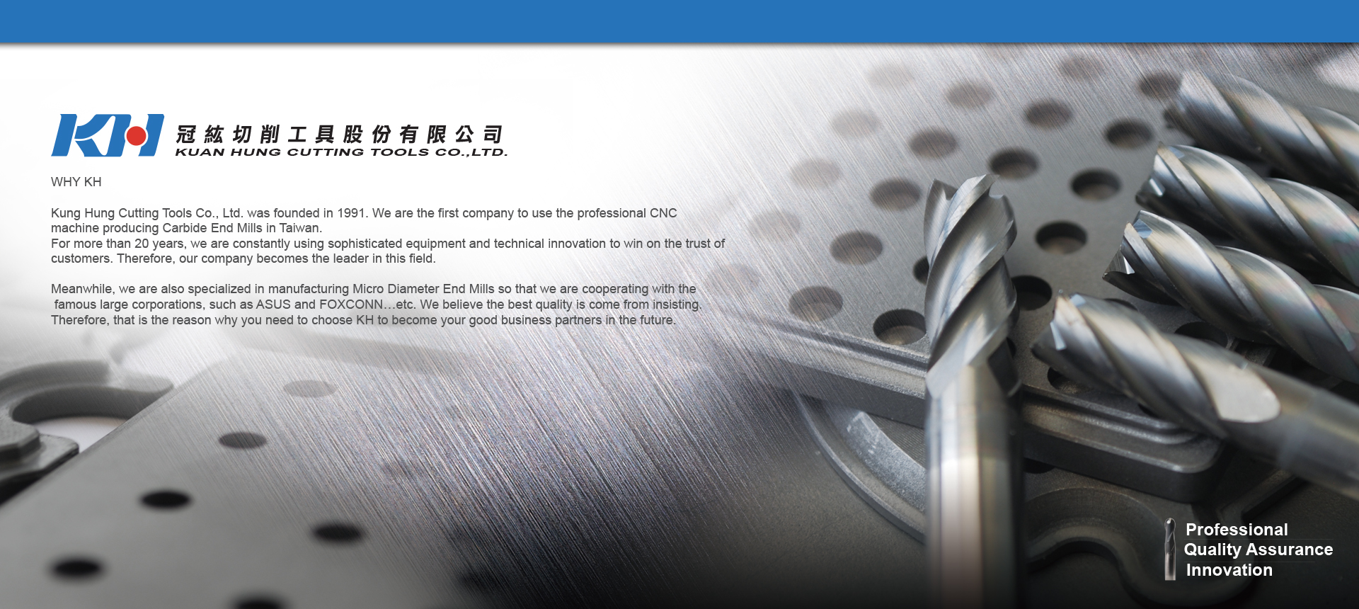 歷經十餘年的歷史,我們不斷以先進的設備跟技術的創新贏取了客戶的信任,並在業界中建立了領導者的地位。同時,我們更是以專精於鎢鋼超微小徑銑刀出名的佼佼者,連國際知名廠商如ASUS及FOXCONN都是我們服務的客戶之一。所以,在將來KH絕對是您合作的好伙伴,因為我們深信品質來自於堅持。